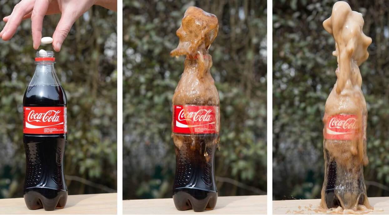В Интернете много видео, где люди кидают конфету «Ментос» в бутылку с колой и бегут от вырывающейся из горла пены. Данный эффект связан с тем, что конфета имеет шероховатости, которые увеличивают количество высвобождающегося углекислого газа. Также конфета очень быстро опускается на дно, что дополнительно провоцирует выброс газа. Особенно сильно этот эффект проявляется при кидании драже в диетическую колу, в которой содержатся подсластители и высохший сок различных видов акаций.