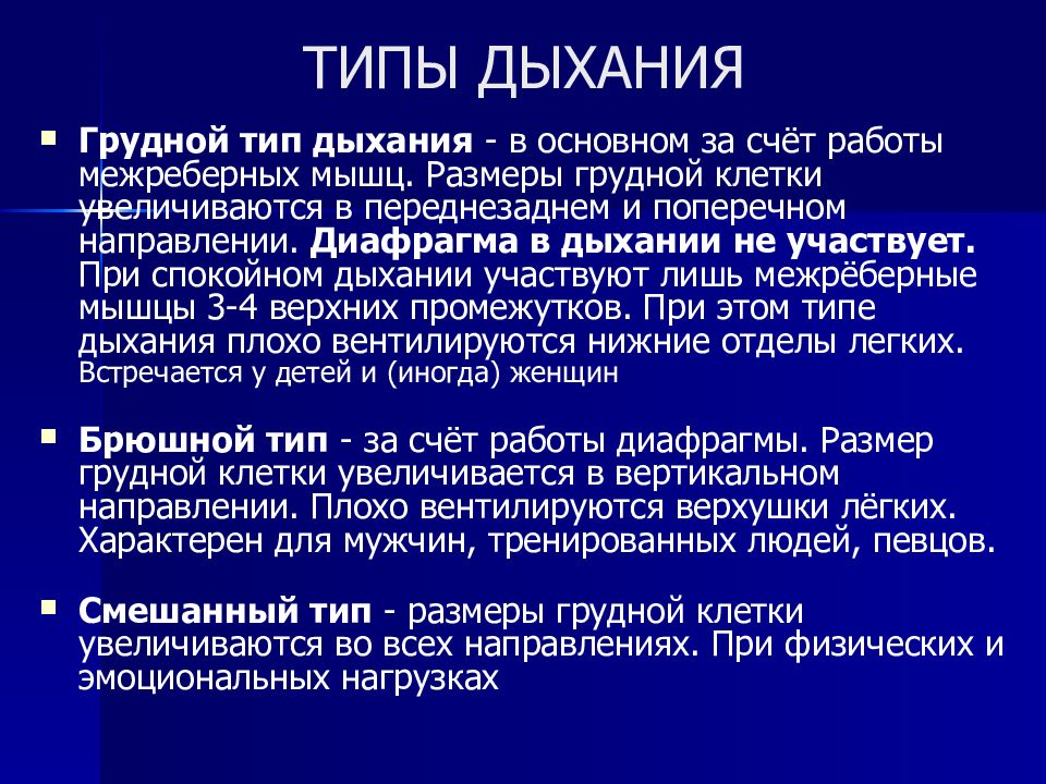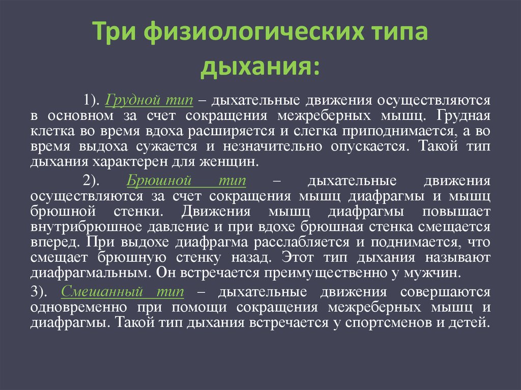 Обычно люди дышат грудью. Но в этом случае в организм поступает недостаточно кислорода, что вредно для внутренних органов, и человек больше подвержен стрессу.