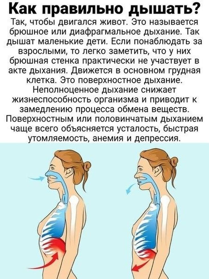 Ещё для нашего организма лучше, если мы набираем воздух животом, а не грудью