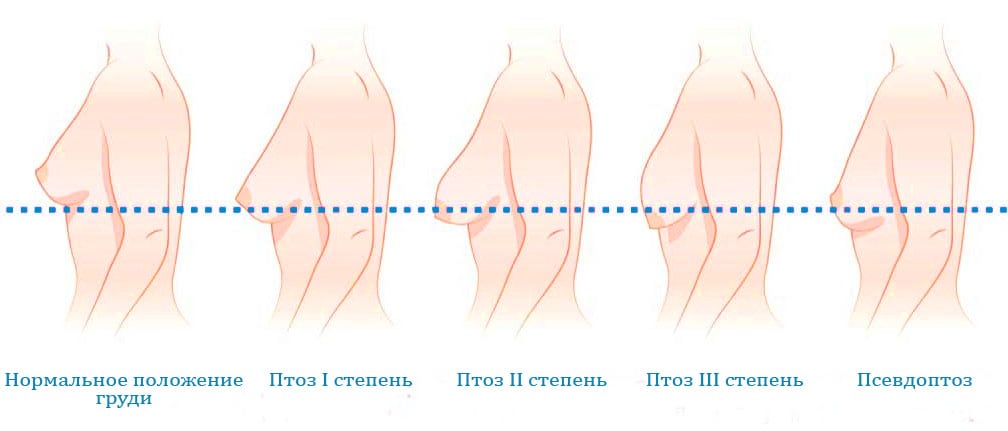 В медицинской практике известны также случаи ложный птоз. Он проявляется в случае, когда ареола находится выше линии под грудью, но молочная железа имеет маленький объем и характеризуется опущением.