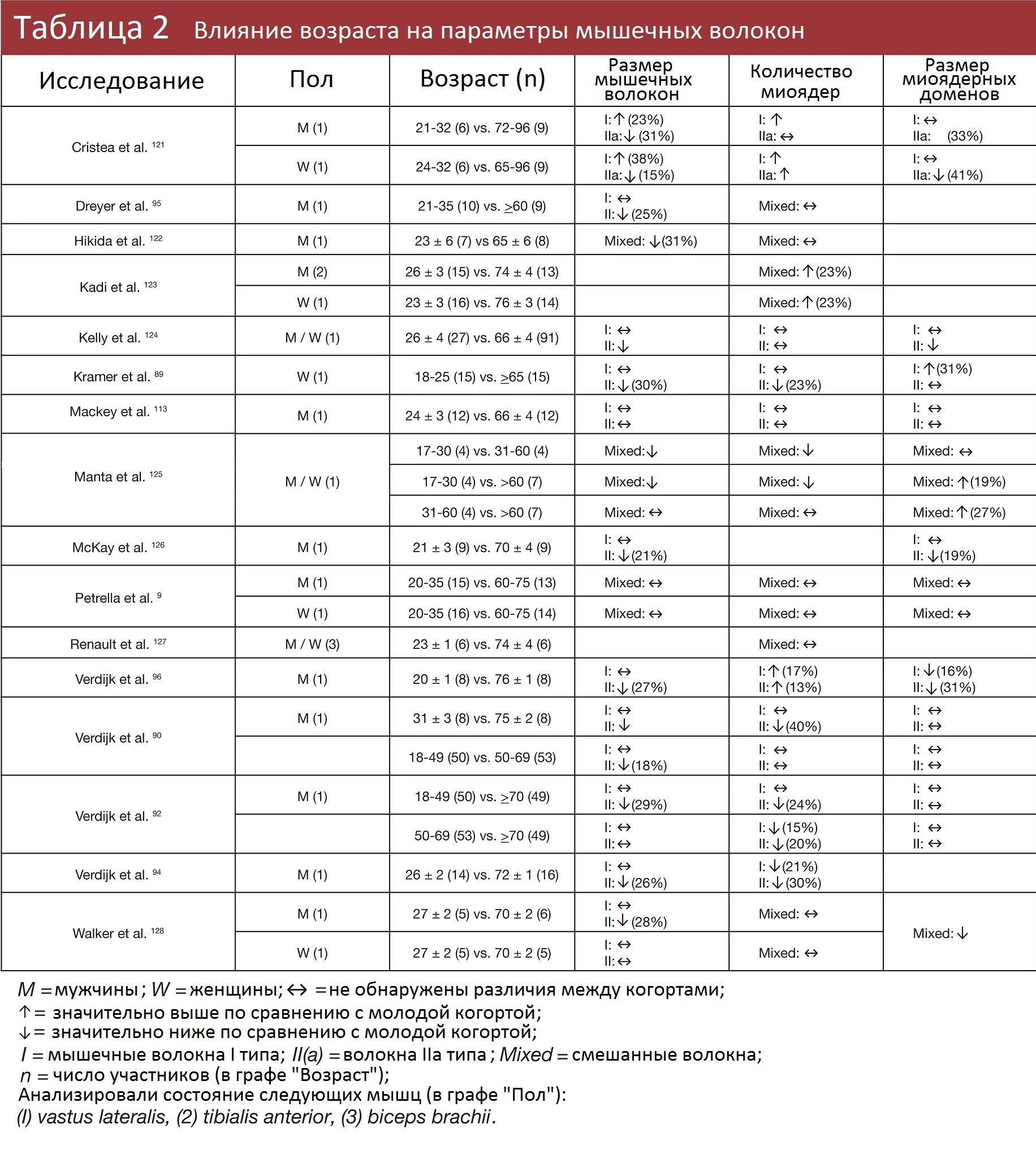 Результаты противоречивые. Я опускаю выводы, связанные с изучением волокон I типа (в большинстве случаев у молодых и пожилых людей ситуация схожа); из тех групп, где рассматривались волокна II типа, в четырех обнаружено уменьшение миоядерных доменов у пожилых, а в семи — у молодых и пожилых участников миоядерные домены схожих размеров.