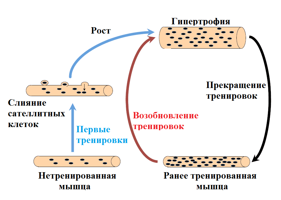 Рост размера мышц связан с повышением количества мио-ядер, которые препятствует появлению атрофии мышц, служат субстратом для продолжительной биологической памяти клеток.