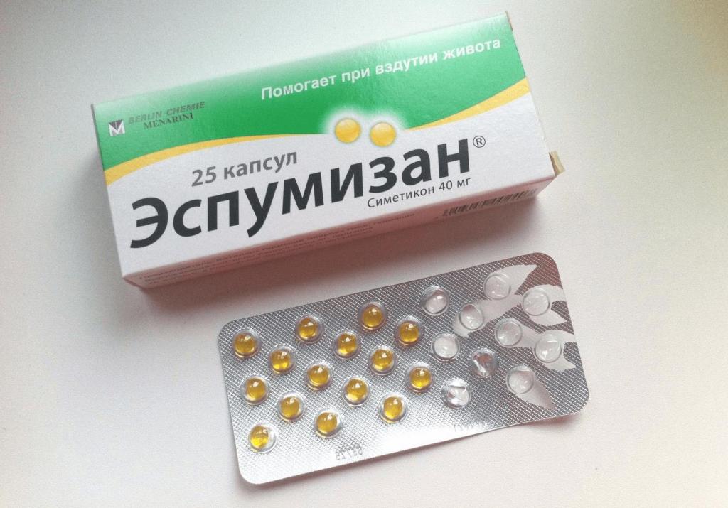 - «Эспумизан». Отличное средство, которое можно применять вне зависимости от причины, которая спровоцировала вздутие. Пьют 4 раза в день по 2 капсулы.