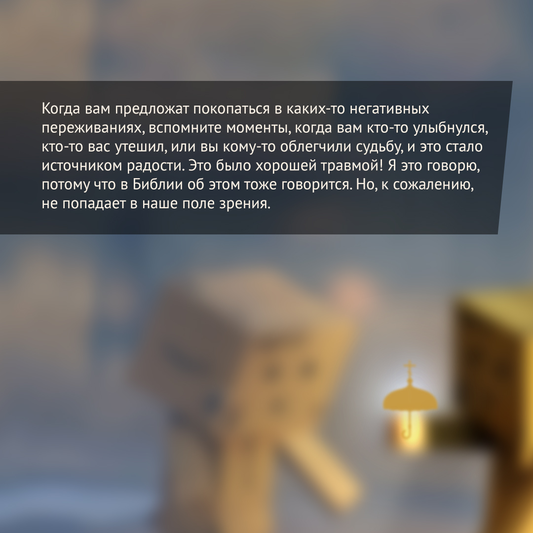 А у меня возникает вопрос: а у вас бывали какие-нибудь положительные травмы? Какие-то моменты радости, которые способны поменять всю вашу жизнь? Ведь травма — это удар, который меняет жизнь, отпечатывается в нервной системе или судьбе. И должны же быть и какие-то положительные травмы тоже!