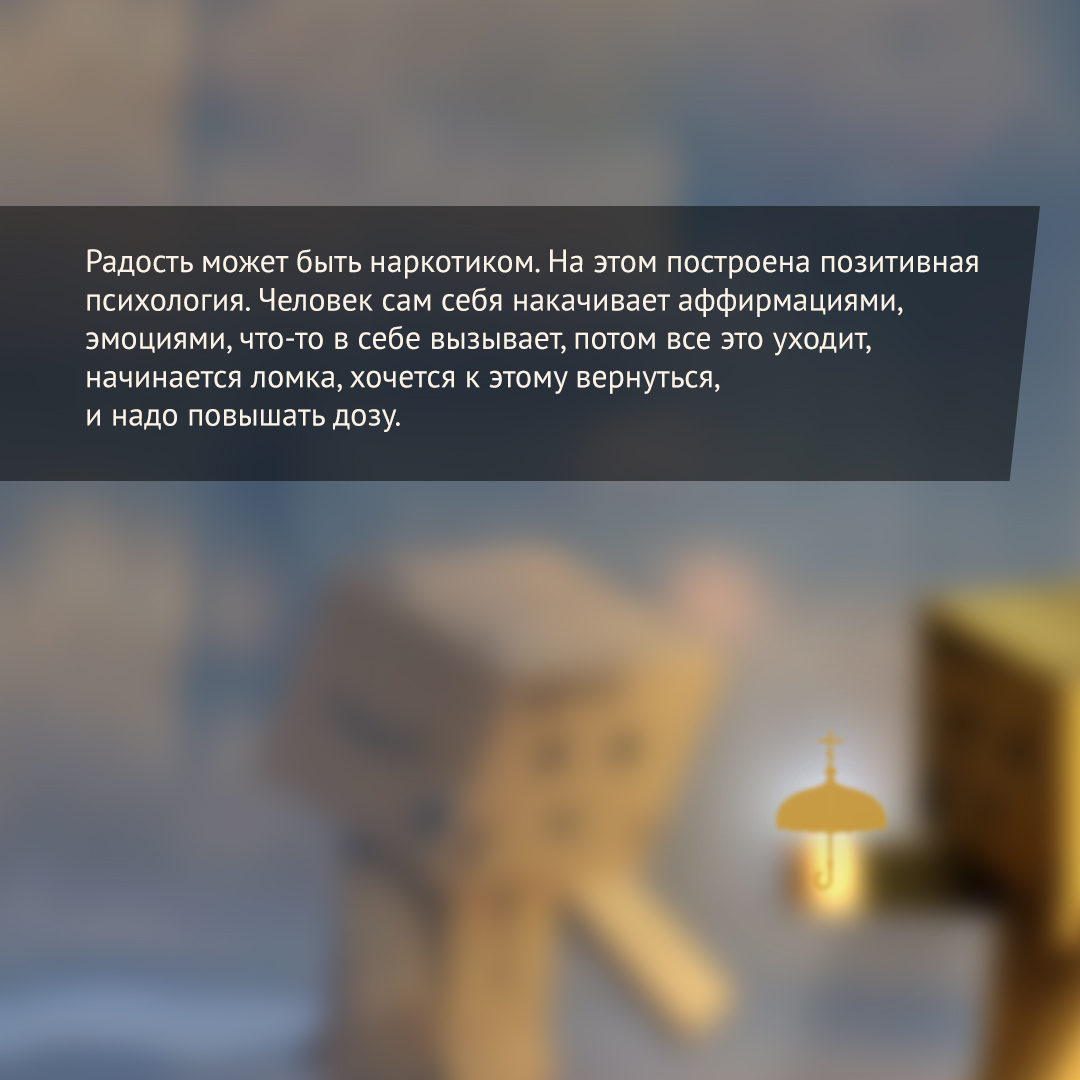 Радость может быть наркотиком. На этом построена позитивная психология. Человек сам себя накачивает аффирмациями, эмоциями, что-то в себе вызывает, потом все это уходит, начинается ломка, хочется к этому вернуться, и надо повышать дозу.