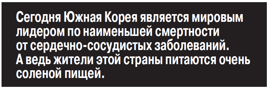 Сегодня Южная Корея является мировым лидером по наименьшей смертности от сердечно-сосудистых заболеваний. А ведь жители этой страны питаются очень соленой пищей. Знаменитая средиземноморская диета, рекомендуемая как самая полезная для сердца, тоже довольно сильно подсолена, взять хотя бы рецепты приготовления анчоусов и сардин.