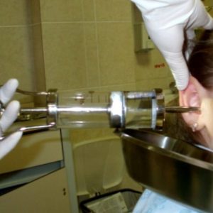Врач первым делом осмотрит ухо. Если оториноларинголог обнаружит в ухе сгусток серы, при этом барабанная перепонка будет целая, значит, доктор сможет провести манипуляцию промывания уха. Промывание проводят с помощью шприца Жане. Врач аккуратно вводит шприц в ухо и нажимает на поршень, направляя струю воды по верхней стенке слухового прохода. Вода заливается за серную пробку и выталкивает ее наружу. Так скопившаяся сера и жидкость вытекают из уха.