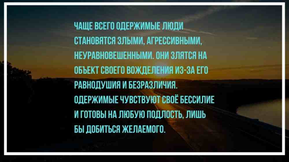 Чаще всего одержимые люди становятся злыми, агрессивными, неуравновешенными. Они злятся на объект своего вожделения из-за его равнодушия и безразличия. Одержимые чувствуют своё бессилие и готовы на любую подлость, лишь бы добиться желаемого.