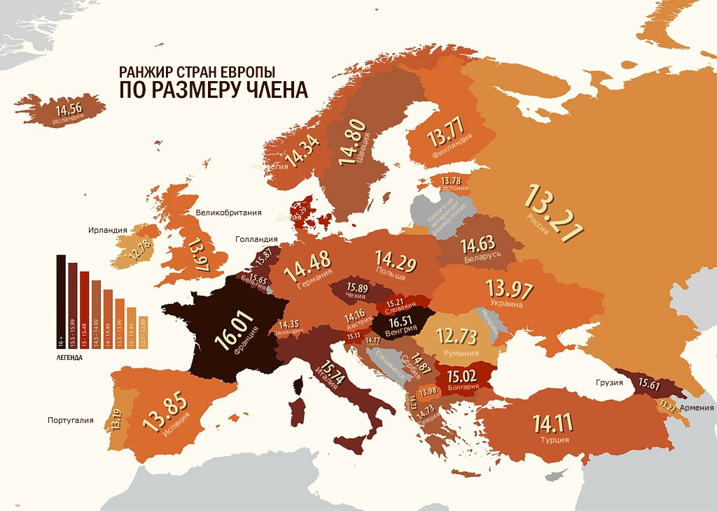 Одно из наиболее масштабных исследований было проведено компанией ZAVA (портал DrEd). Это крупнейшая европейская компания в области цифрового здравоохранения. Задача исследования − выяснить, какую длину члена респонденты считают средней, а какую – идеальной. Было опрошено несколько тысяч женщин и мужчин. В результате выяснилось, что, по мнению мужчин, средняя и идеальная длина составляют 14,1 и 16,6 см соответственно. Женские запросы оказались скромнее. Для полного счастья им хватает 15,8 см, средней длиной они считают 13,8 см.