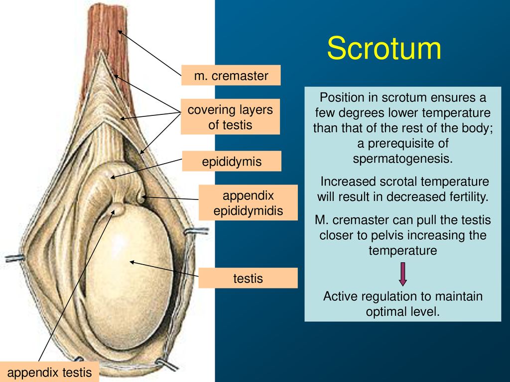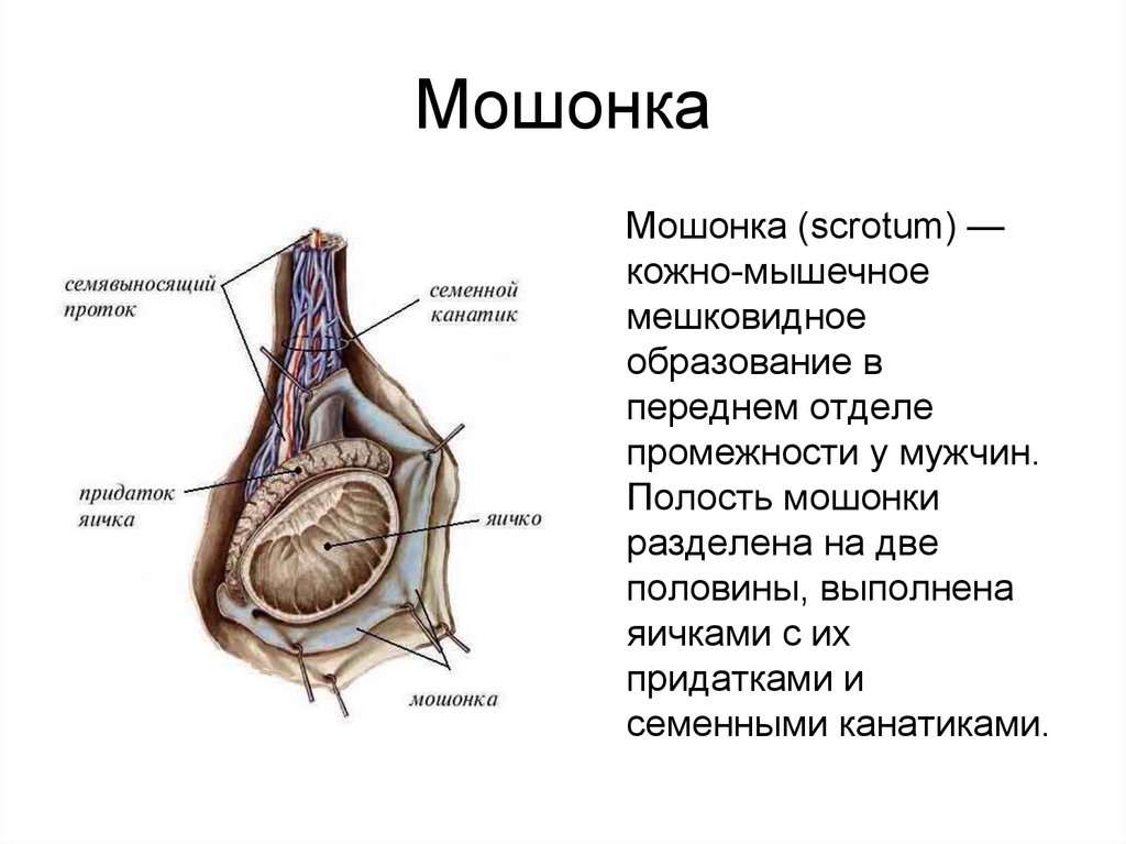 - мошонкой – кожным мешком, в котором находятся яички. Для производства спермы нужна температура примерно на 2°C ниже температуры тела, поэтому яички расположены вне тела в мошонке.