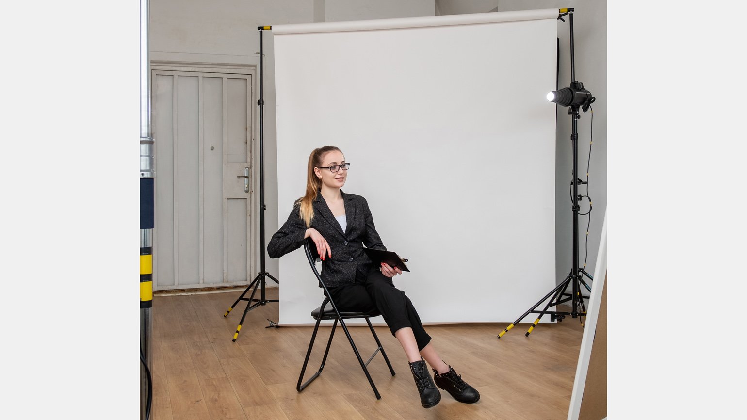 Идеальный фон для съёмки экспертного видео — фактурная стена нейтрального цвета с ярким акцентом — например, картиной или цветком. Если вы снимаете у себя дома и такой ракурс сложно найти, стоит подумать о покупке фотофона и держателя для него. Такой вариант поможет создать студийный антураж, где бы вы ни находились.