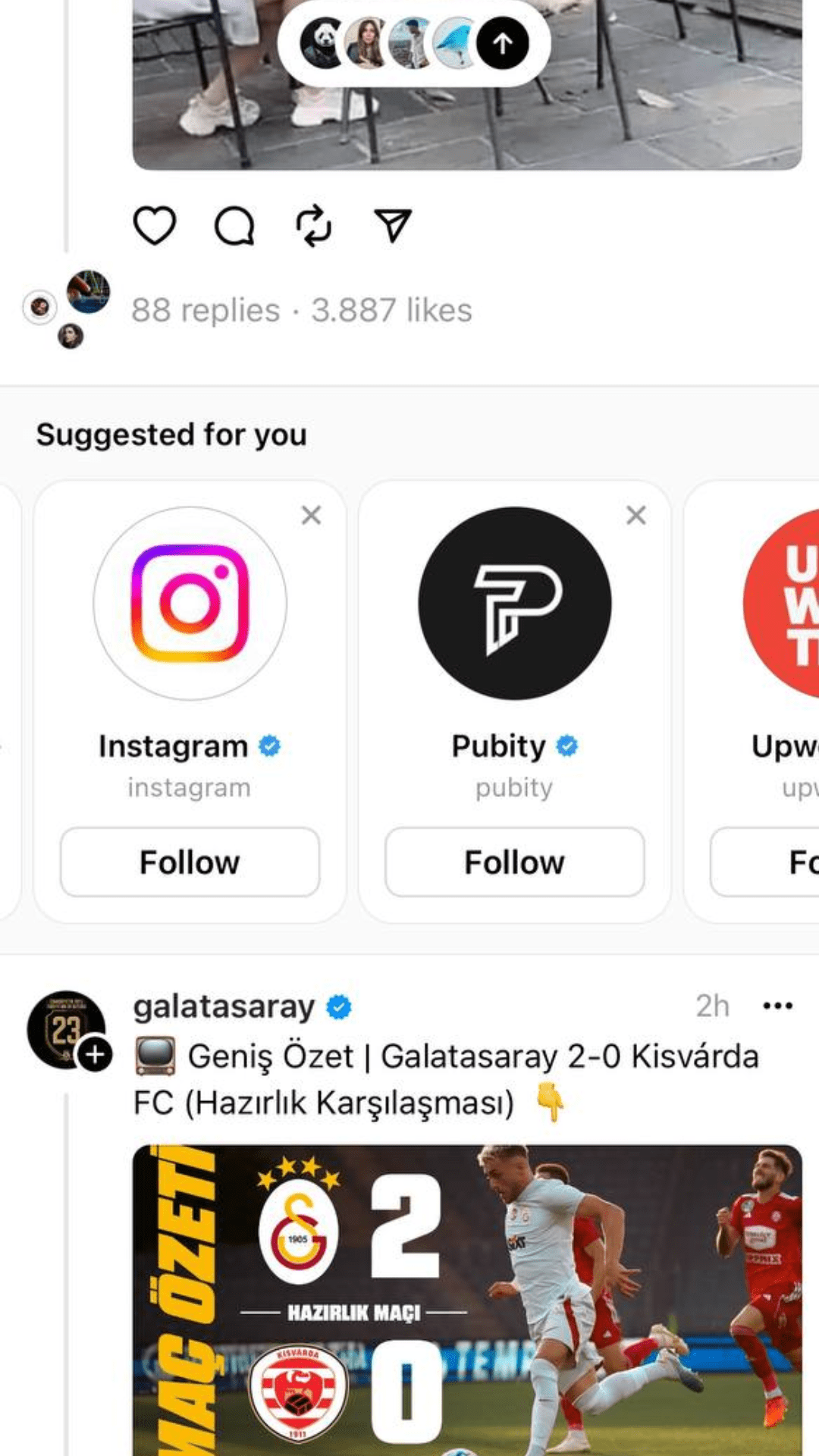 В-четвертых, алгоритм построения ленты. Хоть нам и заявляют о том, что сначала должны быть в ленте ваши подписки, а потом уже сторонние — сейчас ситуация обратная. Моя лента перенасыщена «другим» контентом, и лишь между ним просачиваются публикации из моих подписок.