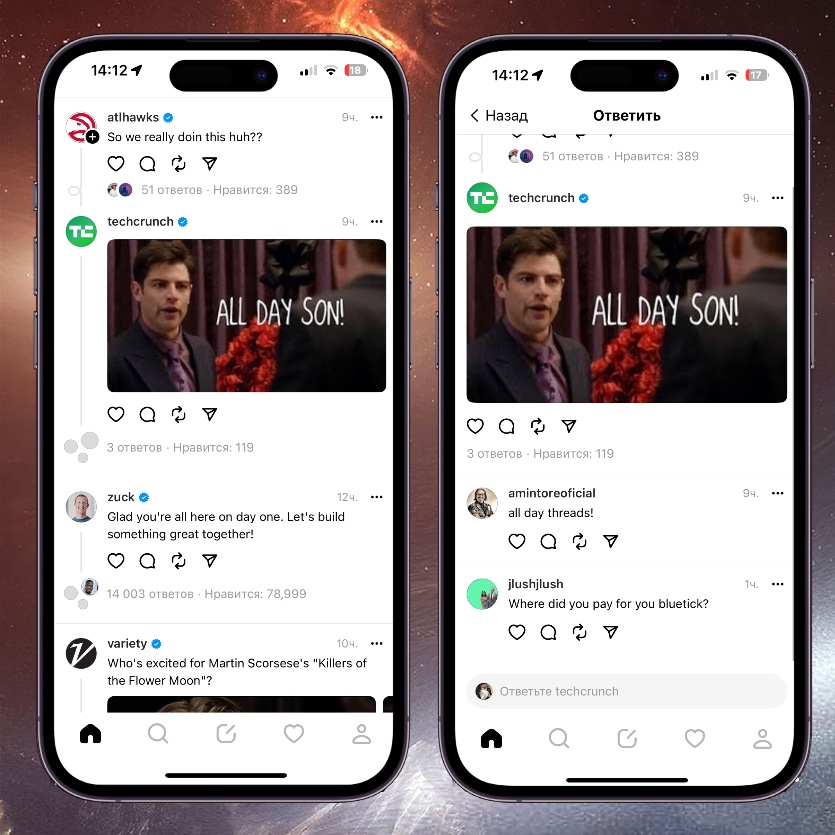 Чисто визуально Threads очень напоминает Twitter. Здесь есть общая лента с «тредами», в которой пользователи могут публиковать свои сообщения длиной до 500 символов. Для сравнения, у Twitter этот лимит сейчас составляет 4000 символов.
