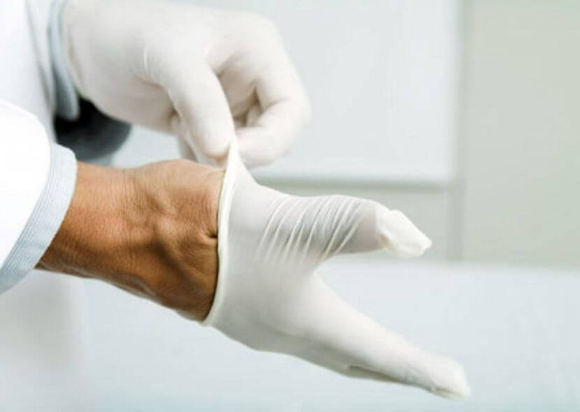 Врач, проводящий правильный массаж предстательной железы надевает перчатки и наносит на указательный палец вазелин.