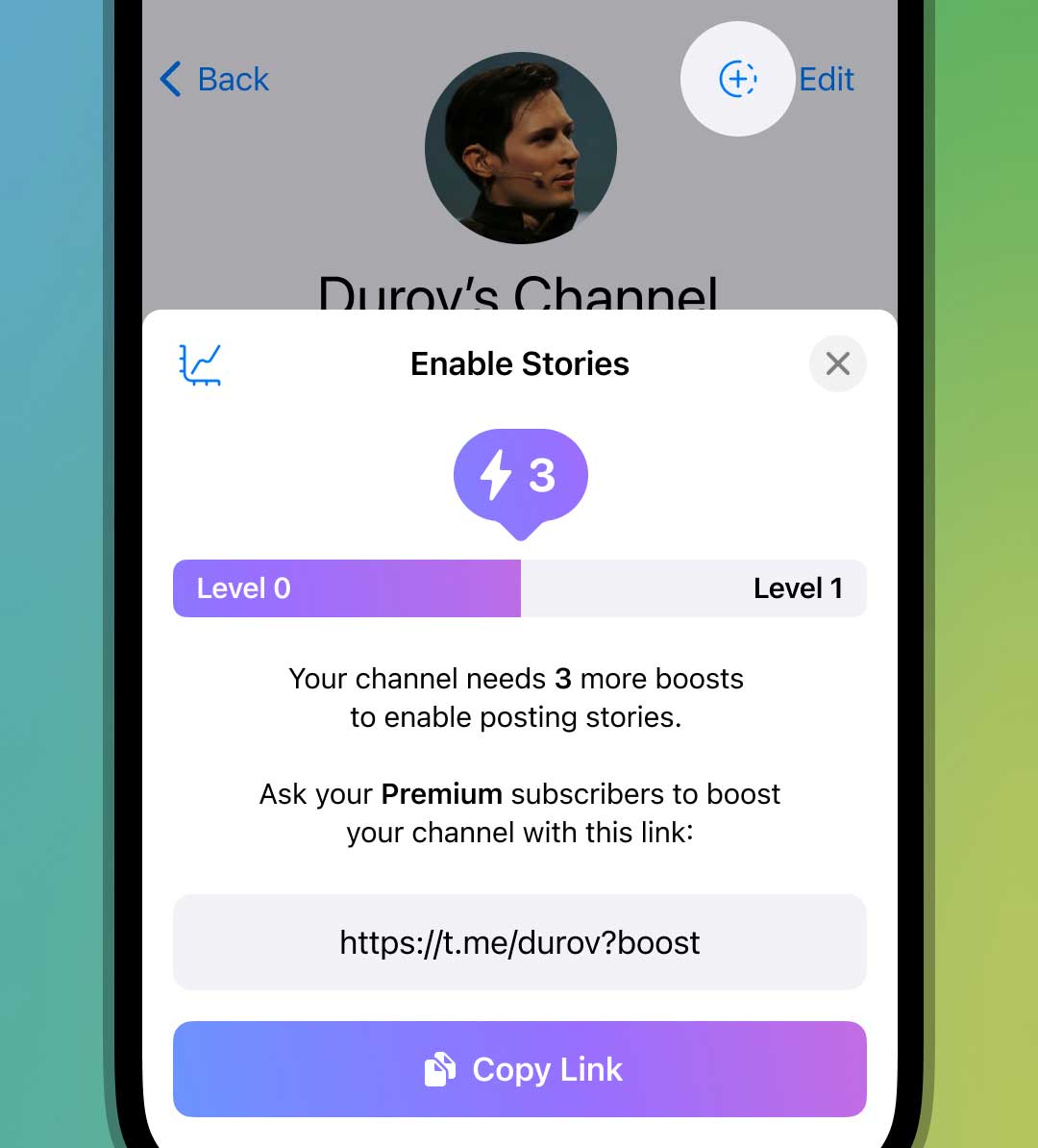 Как мы уже писали ранее, чтобы опубликовать историю в Телеграм, каналу нужно набрать определенное количество голосов и иметь конкретный уровень (1 уровень = 1 история в день). Количество необходимых голосов зависит от количества Premium подписчиков. На данный момент нужно собрать 0,1% подписчиков с премиум подпиской: