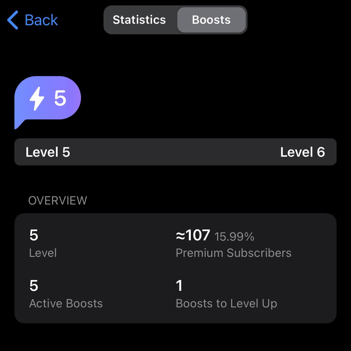 Здесь будет написан ваш уровень, необходимое количество для повышения уровня, количество премиум подписчиков, его процент от общего количества аудитории, а также конкретные профили людей, которые забустили ваш канал и время выдачи буста.