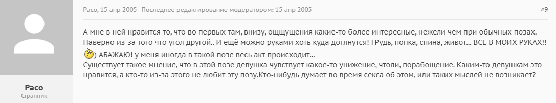 Когда парень любит быть доминантным самцом, но в жизни девушка чаще им управляет, то это идеальная поза отыграться. Весь процесс зависит именно от него, он все контролирует и ощущает власть над своей возлюбленной.