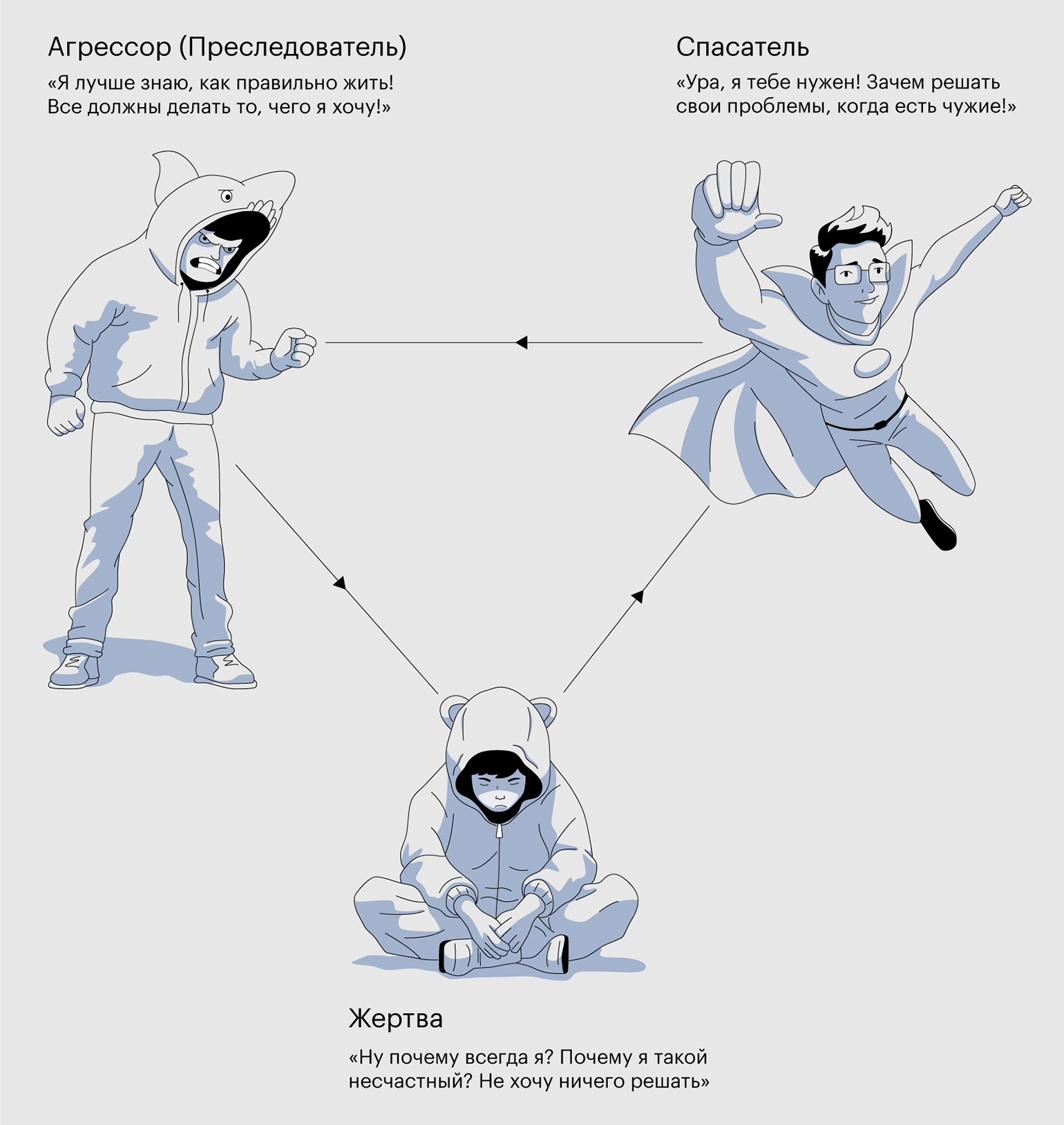 «Жертвы всегда ищут обидчика, виноватого, чтобы переложить на него ответственность за происходящее — вместо того чтобы сказать: „Я могу в этой ситуации сделать вот это и это, я готов проблему решать“. Напротив, они приводят аргументы, почему ничего не могут сделать. Таким образом появляется треугольник Карпмана».