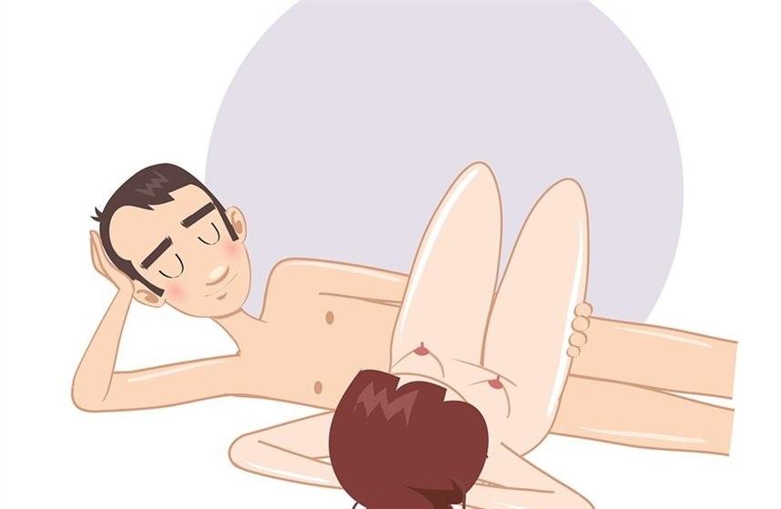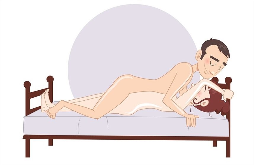 Женщина ложится на бок. Мужчина становится перед ней на колени, садится на нижнее бедро, а верхнее приподнимает и держит рукой