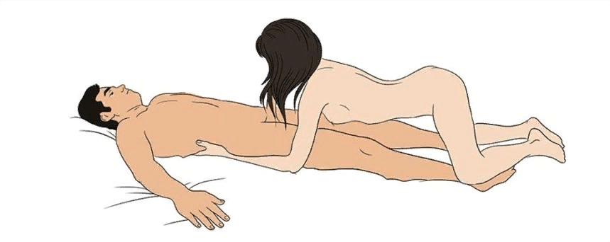 Женщина лежит на спине, партнер раздвигает ноги и зависает над ее ртом спиной к коленям. В этой позе девушка может одновременно ласкать анус и яички мужчины, ускоряя приближение его оргазма.