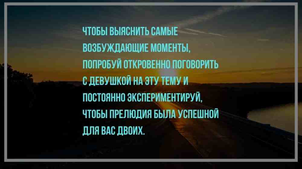 Чтобы выяснить самые возбуждающие моменты, попробуй откровенно поговорить с девушкой на эту тему и постоянно экспериментируй, чтобы прелюдия была успешной для вас двоих.