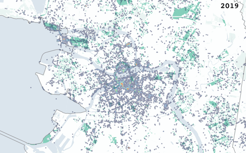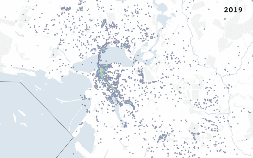 В чем суть этой работы? В том, что мы собрали геолоцированные цифровые следы пользователей, анонимизировали их и нанесли на карту. Именно благодаря геопривязке можно увидеть некоторые пространственные портреты города ― в «мирное» время, и в экстремальной ситуации.