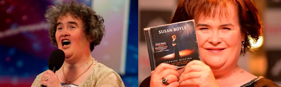 Британская певица Сьюзан Бойл, которая стала известной после своего выступления в шоу «Britain’s Got Talent» в 2009 году, начала свою карьеру в возрасте 47 лет. Со сцены она заявила, что мечтает стать профессиональной певицей, и на вопрос одного из судей: «А почему это не произошло раньше?» ответила: «Шанс мне не представился, но я надеюсь, что здесь всё изменится». Так и произошло.