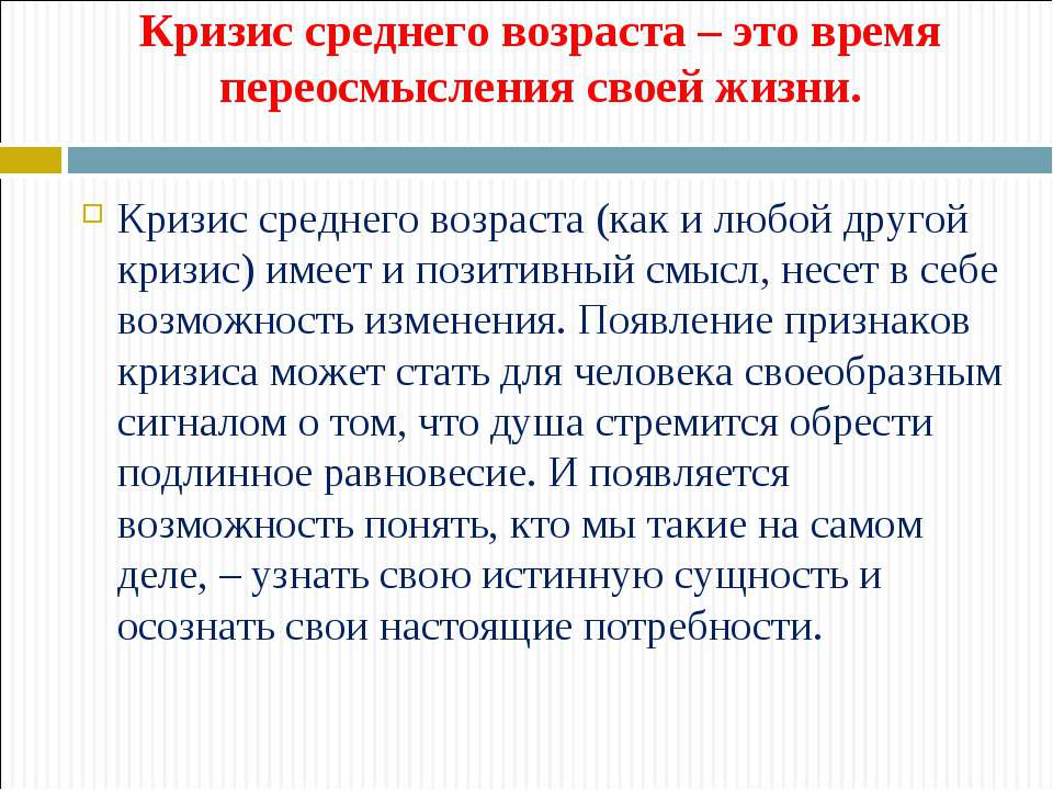 Отнеситесь к кризису середины жизни как к возможности пересмотреть свои ценности. Они могут меняться из года в год и это нормально. С возрастом ощущение личностного роста и целеустремленности уменьшаются. Но набирают силу и ценность хороших отношений с другими людьми, умение ориентироваться в обстановке и проявлять свое мастерство