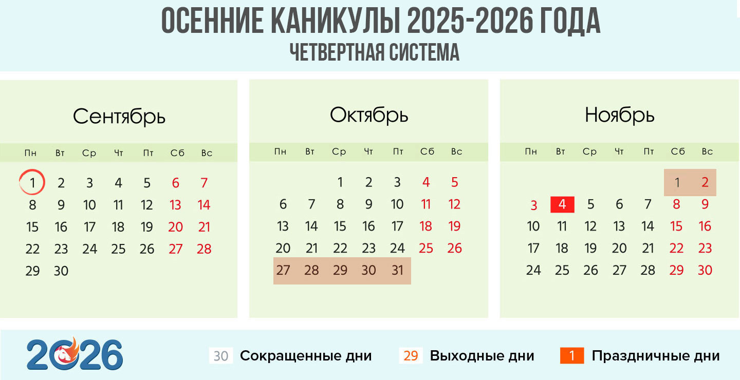 Первый учебный день 2-й четверти – среда 5 ноября, ведь во вторник 04.11.25 школьники снова будут отдыхать, отмечая День народного единства, а на предшествующий празднику понедельник официально перенесли субботу 01.05.25.
