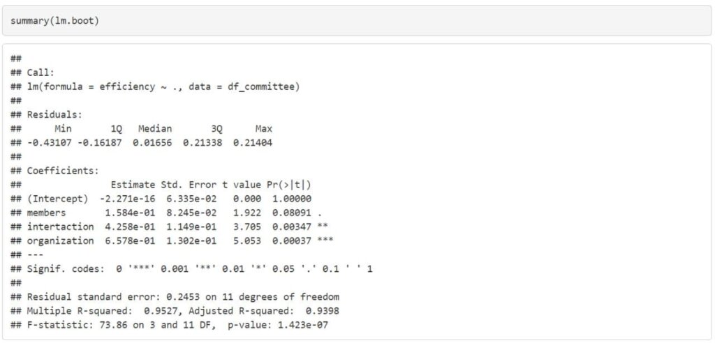 Эконометрическая модель из диплома. Я построила линейную регрессию, которая оценивает значимость разных факторов в оценке эффективности команды. Выяснилось, что самый значимый фактор — это грамотная организация командной работы