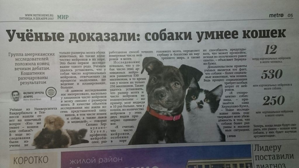 Кстати, несколько слов по поводу «отупения» зверей из-за одомашнивания. Это многолетнее мнение оказалось ни на чем не основанной байкой. Число нейронов примерно одинаково у представителей диких и одомашненных видов.