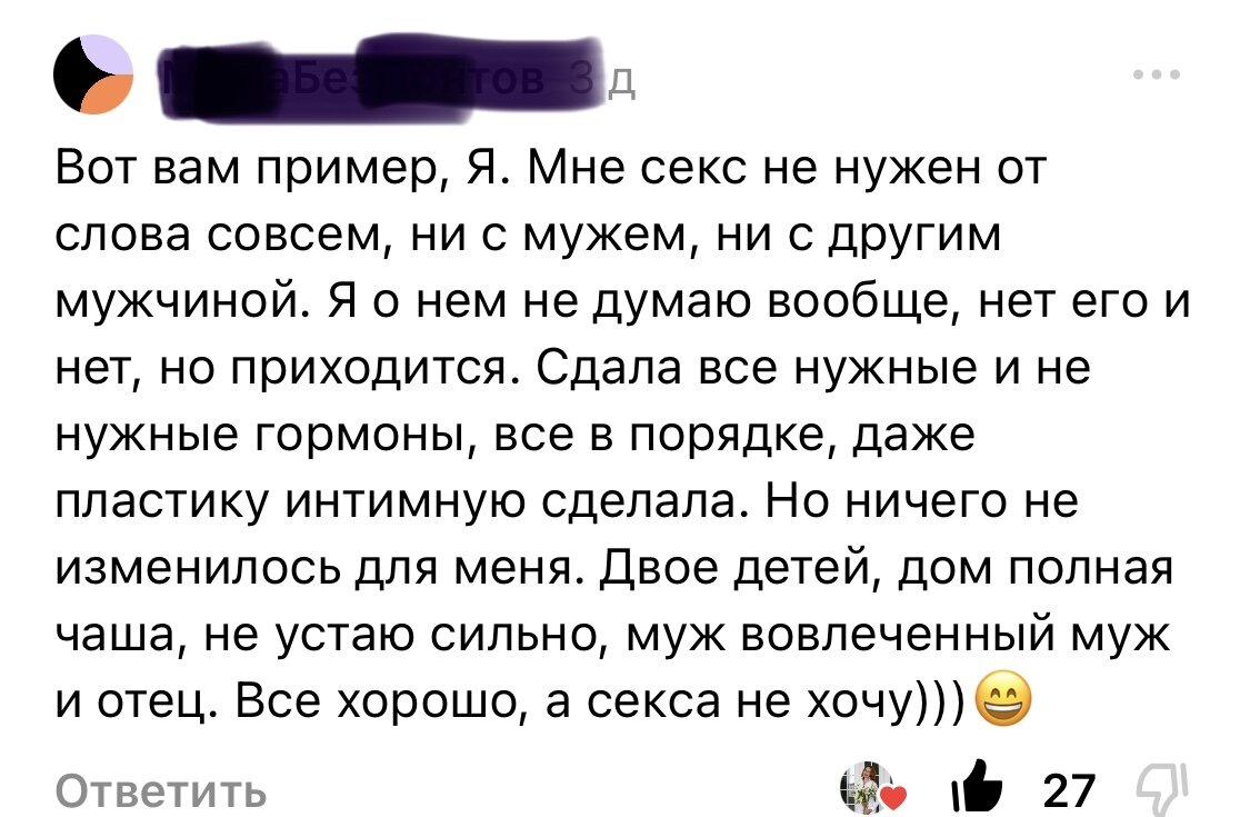 И мужья, зачастую, остаются предоставлены самим себе. Просто в жизни женщин так много требований, обязанностей и условий, что секс, поскольку он кажется им необязательным, часто скатывается вниз по лестнице приоритетов. Многие жены не считают секс необходимым для брака.